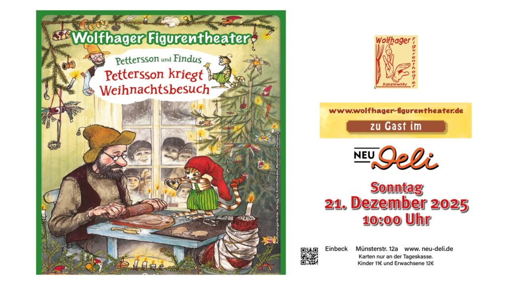 Kurz vor dem Fest sorgen wir für die ultimative Einstimmung: Das Wolfhager Figurentheater bringt Pettersson kriegt Weihnachtsbesuch auf die NEU-Deli-Bühne. In ihrer neuesten Inszenierung lässt das traditionsreiche Figurentheater die Puppen zum gleichnamigen Kinderbuch von Sven Nordqvist tanzen.