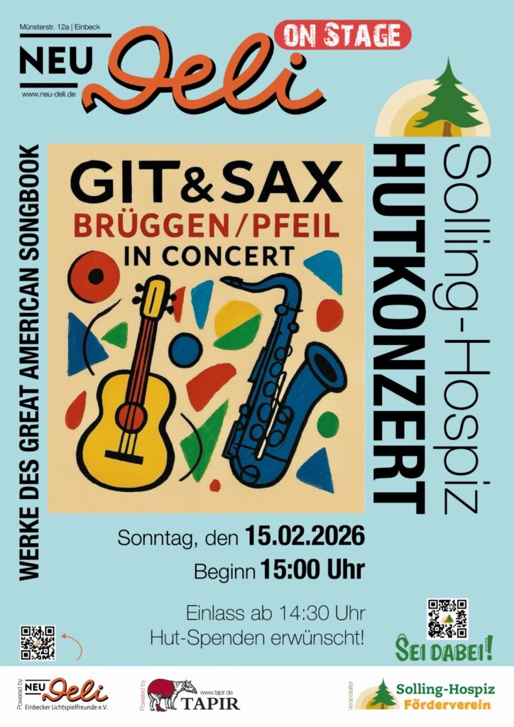 Das Duo GIT & SAX lädt das Publikum zu einer besonderen Reise durch zeitlose Jazz- und Swing-Kompositionen aus dem Great American Songbook ein. GIT & SAX steht für Gitarre (Hein Brüggen) und Saxophon (Michael Pfeil). Die beiden Musiker spielen ein „Hut-Konzert“, das bedeutet, der Eintritt ist frei und das Publikum wird um „Spenden in den Hut“ gebeten. Alle Spenden kommen dem Solling-Hospiz Christine Amalie zugute.
